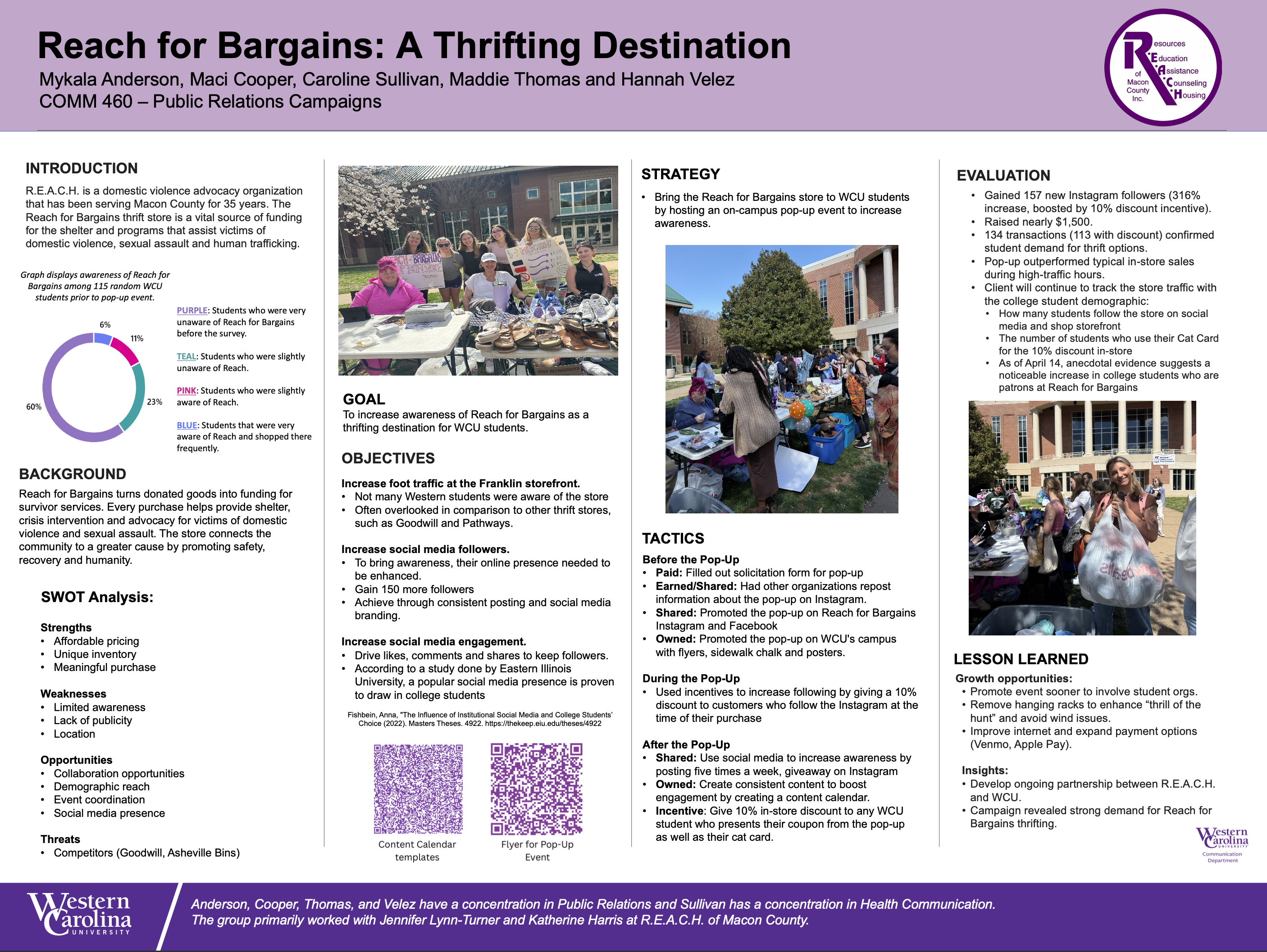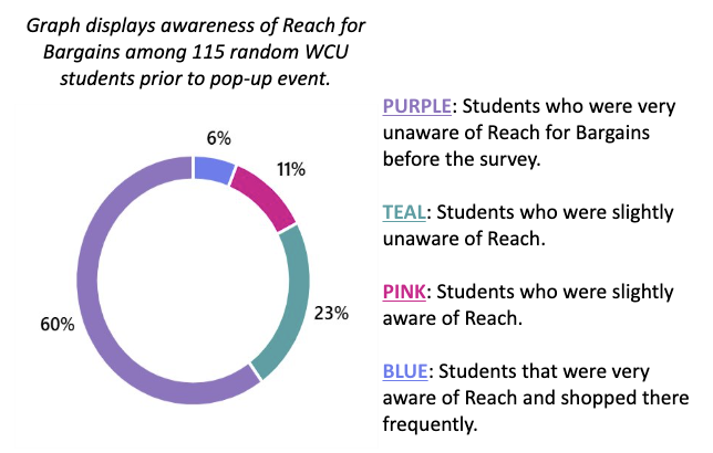 To measure the success of our campaign, our team distributed a survey among 115 random students at Western Carolina University. Results found that 83% of respondents were unaware of Reach for Bargains prior to the campaign.
