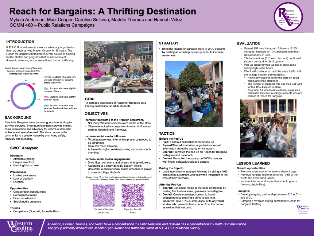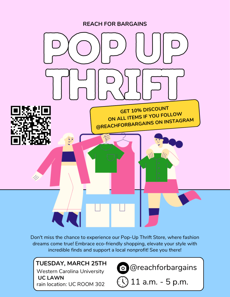The goal was to increase awareness of their bargain store, Reach for Bargains, as a thrifting destination among Western Carolina University students. We did this by hosting a Pop-up Thrift Store.