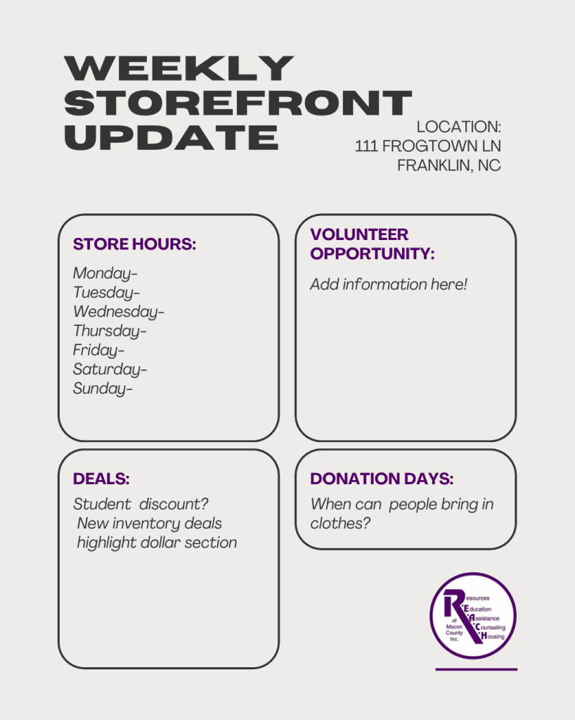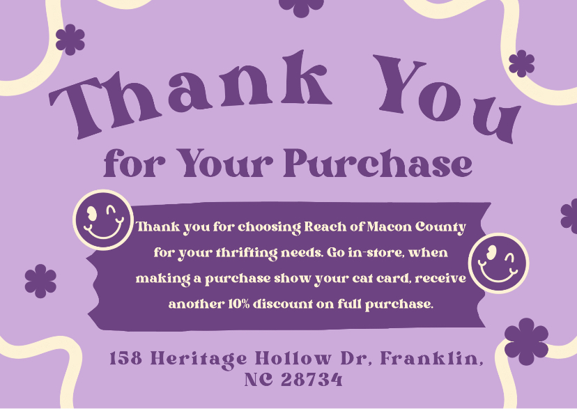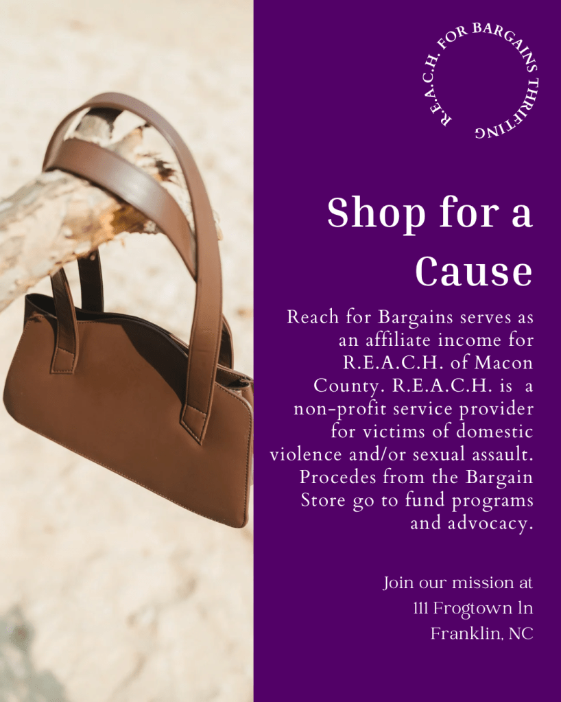 R.E.A.C.H. of Macon County is a nonprofit organization in Franklin, NC whose mission is to eradicate domestic violence and sexual assault crimes in Macon County. Reach for Bargains serves as an affiliate income for R.E.A.C.H. of Macon County.